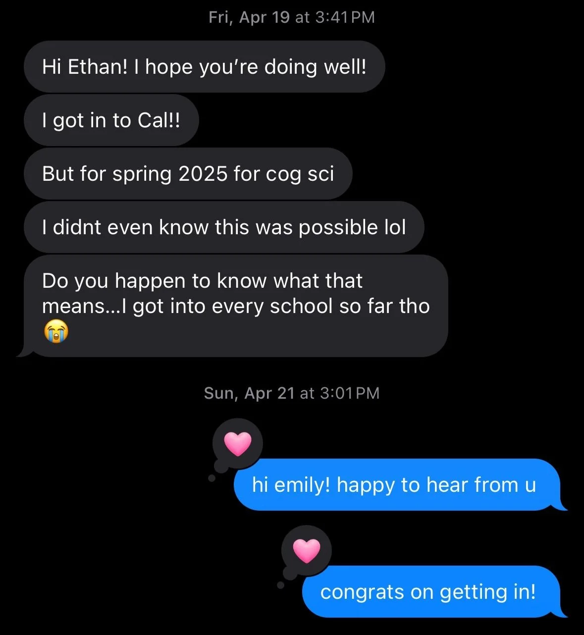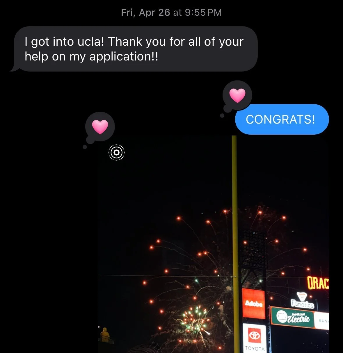 Ethan helped me so much throughout the transfer process. Providing solid feedback for my PIQs and guiding me when trying to organize my extracurriculars. He always made sure that I understood every step of the transfer process and worked really hard answering any questions I had promptly.